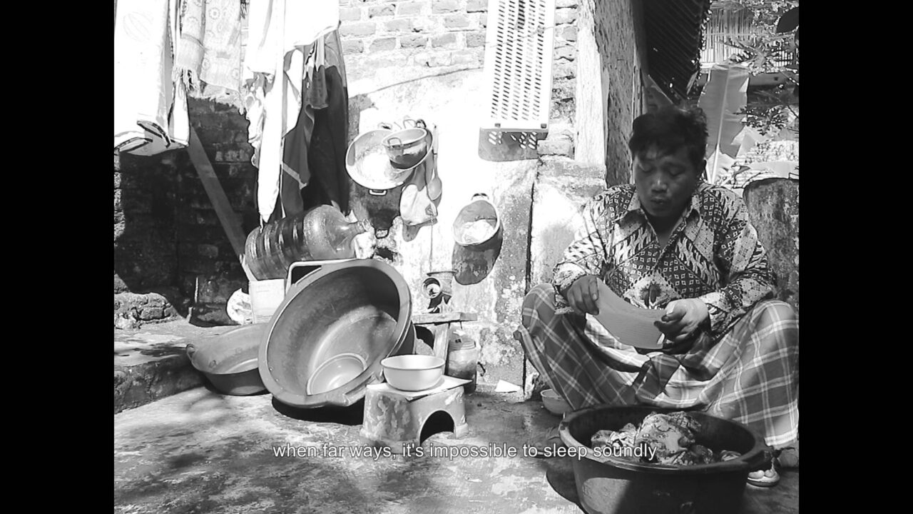 Film hitam putih ini dibuka dengan adegan seorang bapak bernama Muhtadi Jarot menyanyikan lagu untuk istrinya yang merantau ke luar negeri. Muhtadi, yang bekerja sebagai seorang tukang pijat keliling, tinggal bersama anak dan ibunya. Dengan bahasa tanpa pretensi, film ini memperlihatkan potongan-potongan keseharian ketiga anggota keluarga yang sederhana. Dan kerinduan Muhtadi akan istrinya membuat sosok istrinya terasa jelas dan dekat walaupun ia tidak hadir dan terdengar di film ini.